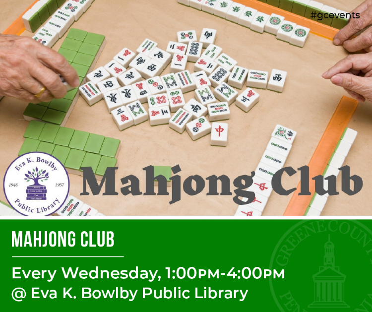 Mahjong Club is meets every Wednesday from 1 to 4pm at Eva K Bowlby Public Library!