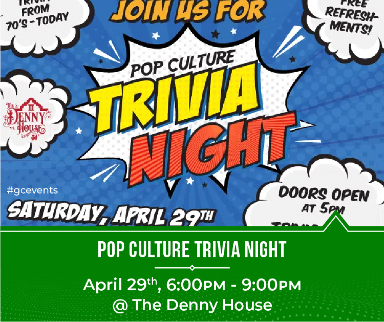 Join The Denny House for Pop Culture Trivia Night on Saturday, April 29th. Trivia from 70’s to today. Doors open at 5pm, trivia begins at 6pm.