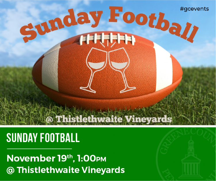 Join Thistlethwaite Vineyards for a fun day of football watching in the tasting room. From 1pm to 4pm on Sundays, there will be complimentary hearty appetizers along with wine, wine slushies and beer for purchase.