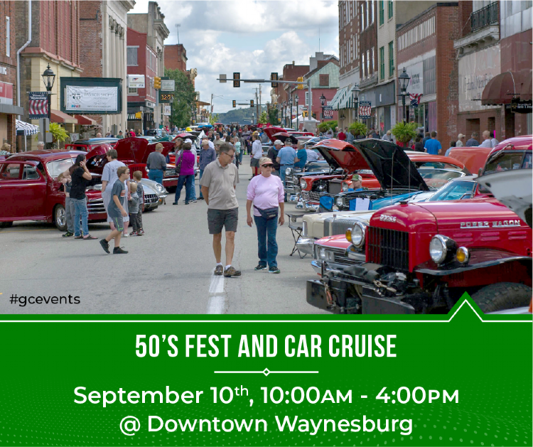 50s Fest & Car Cruise takes over Waynesburg from 10am to 4pm on Saturday, September 10th! Downtown Waynesburg is blocked to traffic and we park along the main drag while enjoying 50’s music all day, food and fun. All the specialty shops are open, too! So dress in your 50’s best and come join the fun!