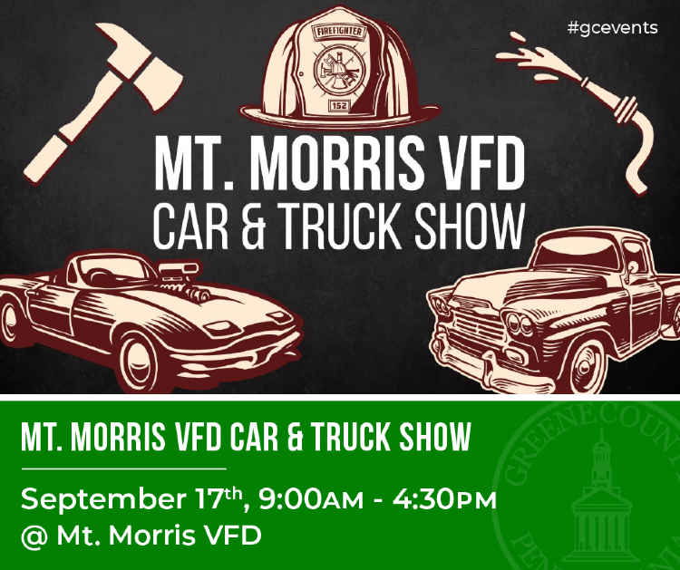 Music from the 50’s and 60’s play while cars and trucks shine in Mt. Morris during the annual Volunteer Fire Department’s car show on Sunday, September 17. Chicken BBQ dinners, hot dogs and drinks are available for purchase at noon. Event held rain or shine.