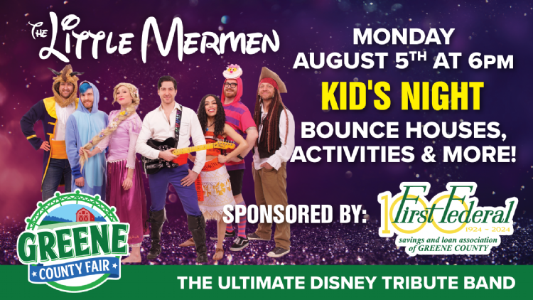 Dive into a world of magic and music at the Greene County Fair with The Little Mermen, the ultimate Disney tribute band! Experience an enchanting evening as they perform rock covers of all your favorite Disney songs, live and in full costume. Perfect for Disney fans of all ages, this nostalgic, high-energy show promises to bring the romance and adventure of Disney classics to life right before your eyes. Don't miss your chance to sing along and relive the magic with The Little Mermen at the fairgrounds!